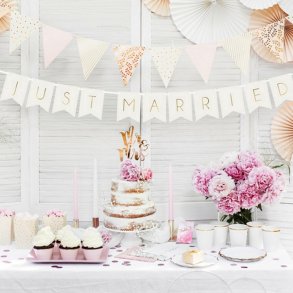 Sød Guirlande med 12 triangel flag i lyserød, hvid og guld. Flagene skal sættes på den medfølgende snor, så er du klar til at fejre bryllup, barnedåb, babyshower eller 1 års fødselsdag.